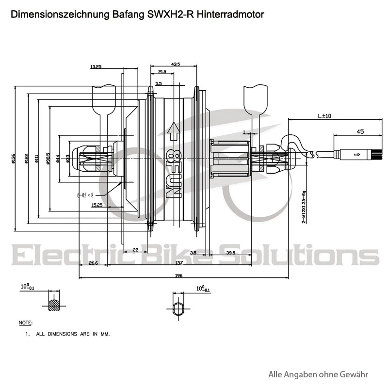 Der Bafang SWXH2-R Motor hat bereits eine moderne Steckkassettenaufnahme. Der Bafang SWXH2-R verfügt über einen Freilauf und eine 6-Loch-Bremsscheibenaufnahme. Der Motor wird uneingespeicht geliefert, kann jedoch auf Wunsch auch eingespeicht werden. Der Bafang hat wie üblich 36 Speichenlöcher und Hallsensoren. Das Motorkabel am Gehäuse hat eine Länge von ca. 18cm. Passende Verlängerungskabel können Sie hier dazubestellen. Wählen Sie den Motor passend für Ihre Felgengrößen.